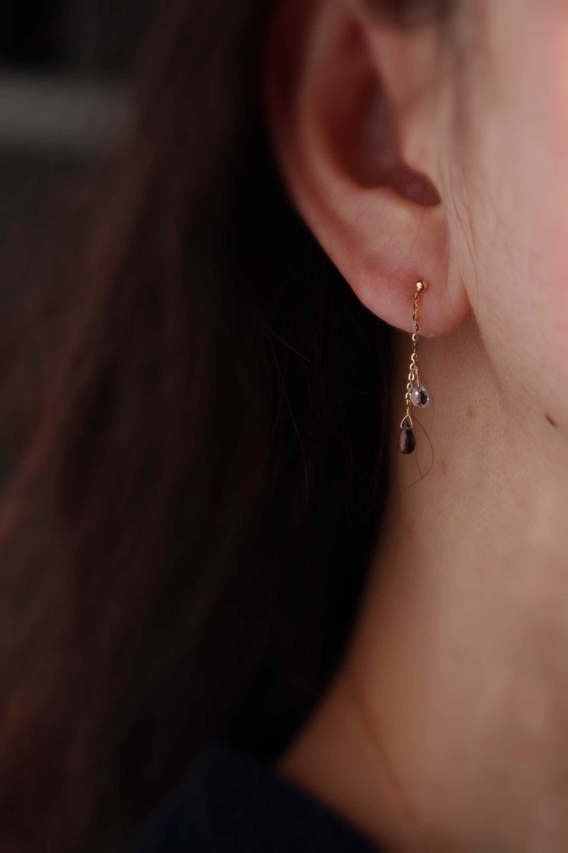 18kt solid yellow gold chain earrings are attached with two natural tiny stones ( white topaz/ smoky quarts )