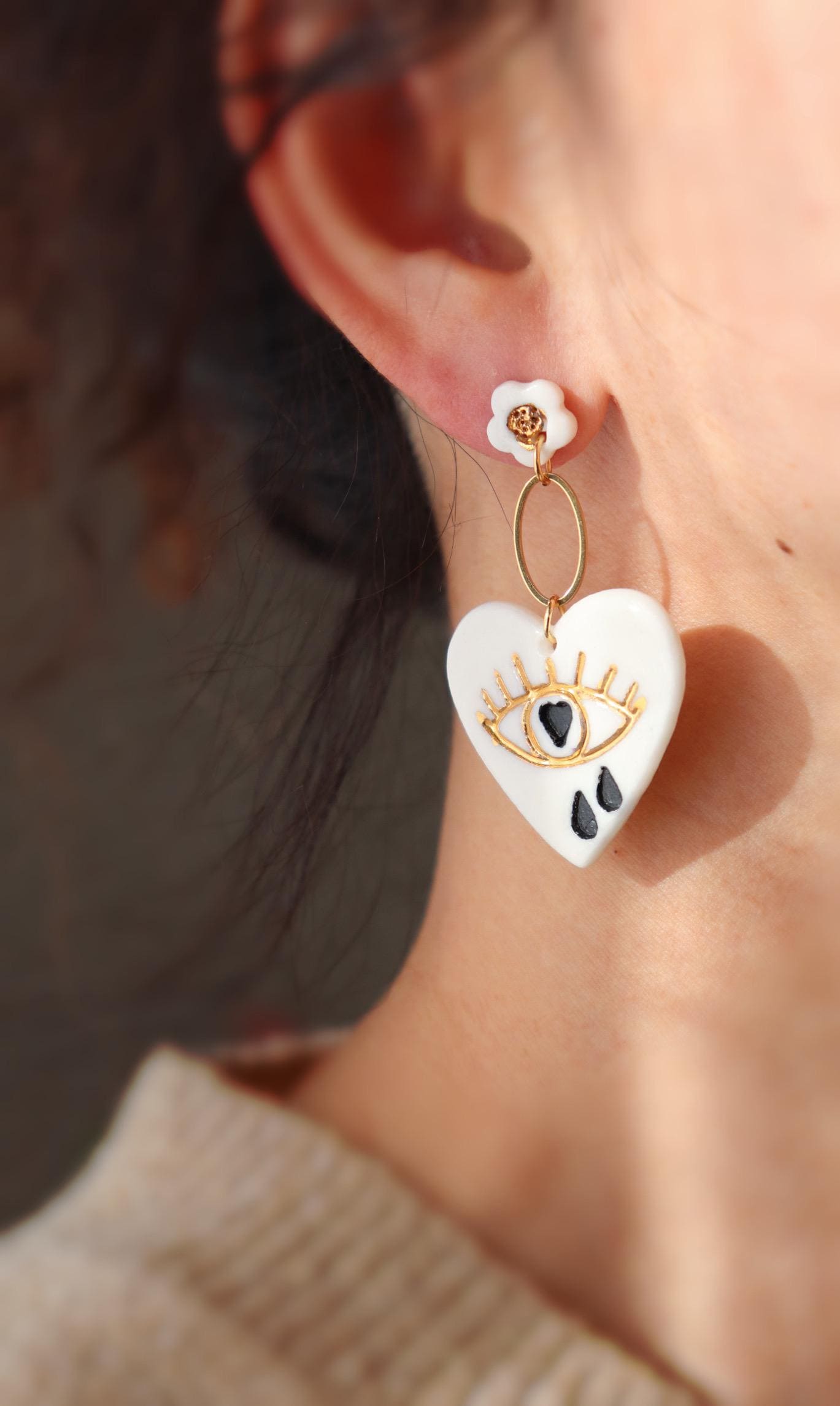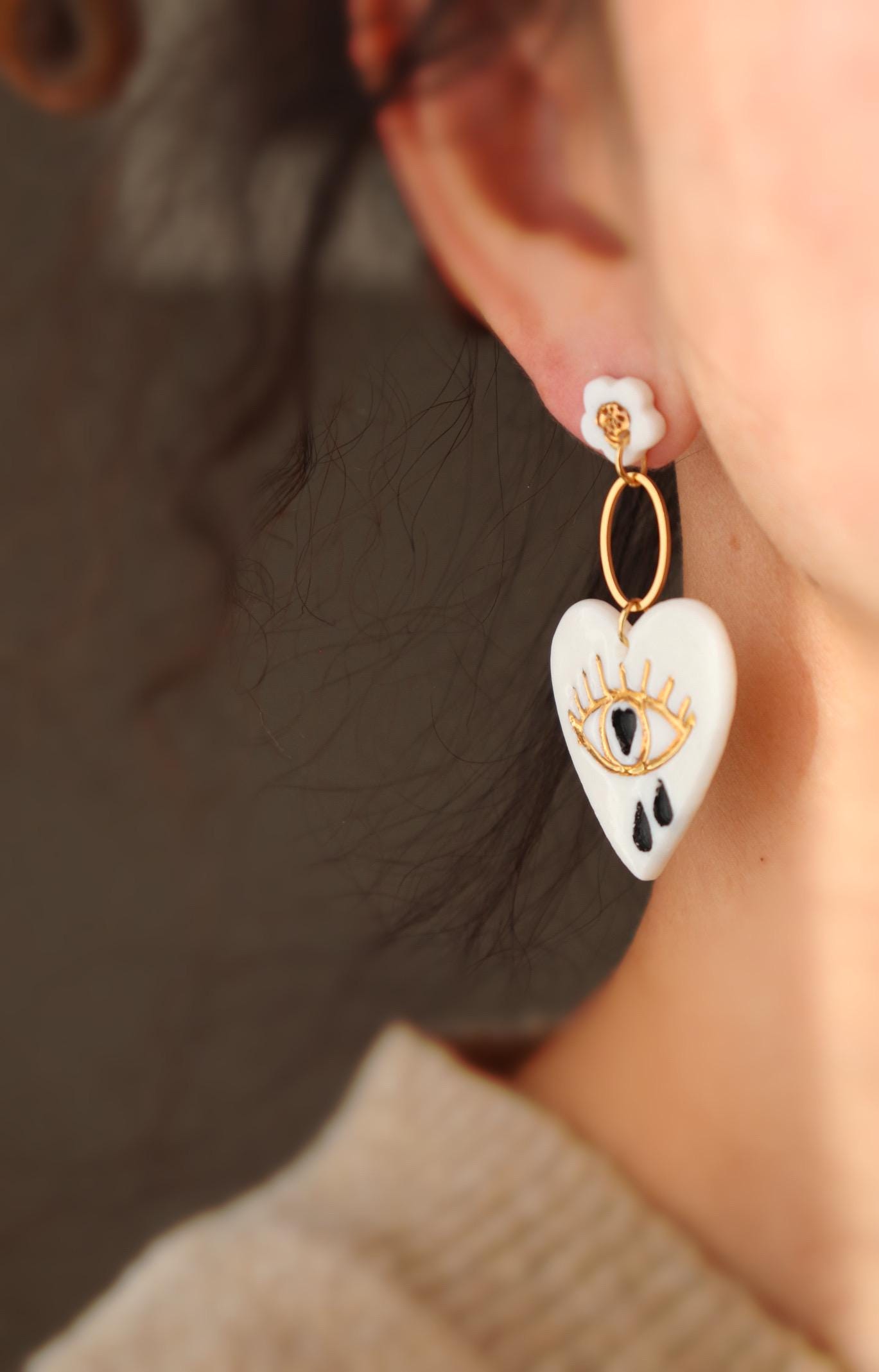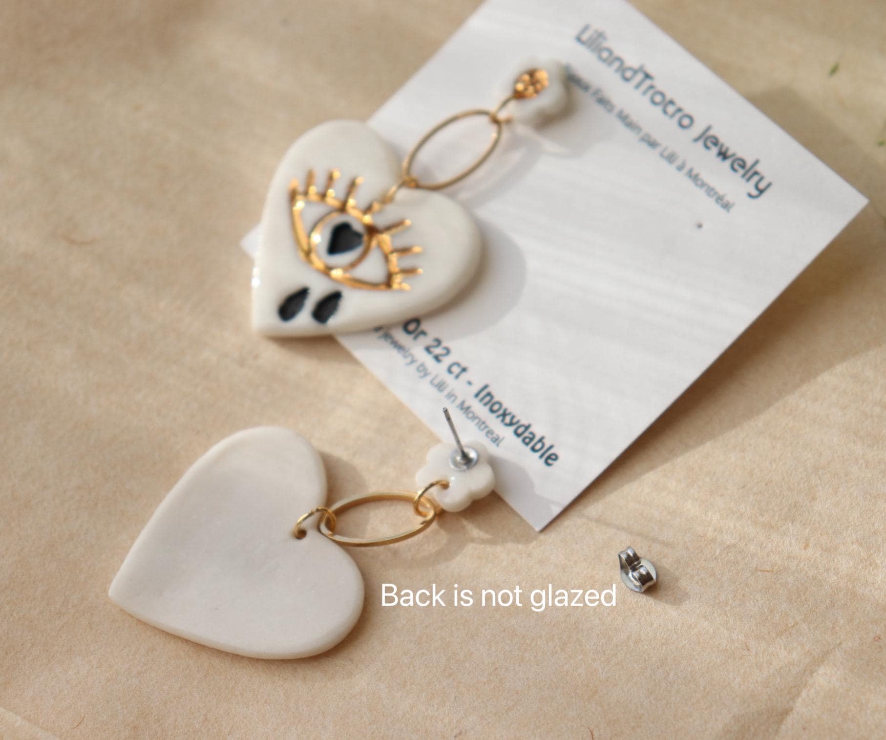 Handpainted heart shaped porcelain earrings are one of the kind and eye-catching.
