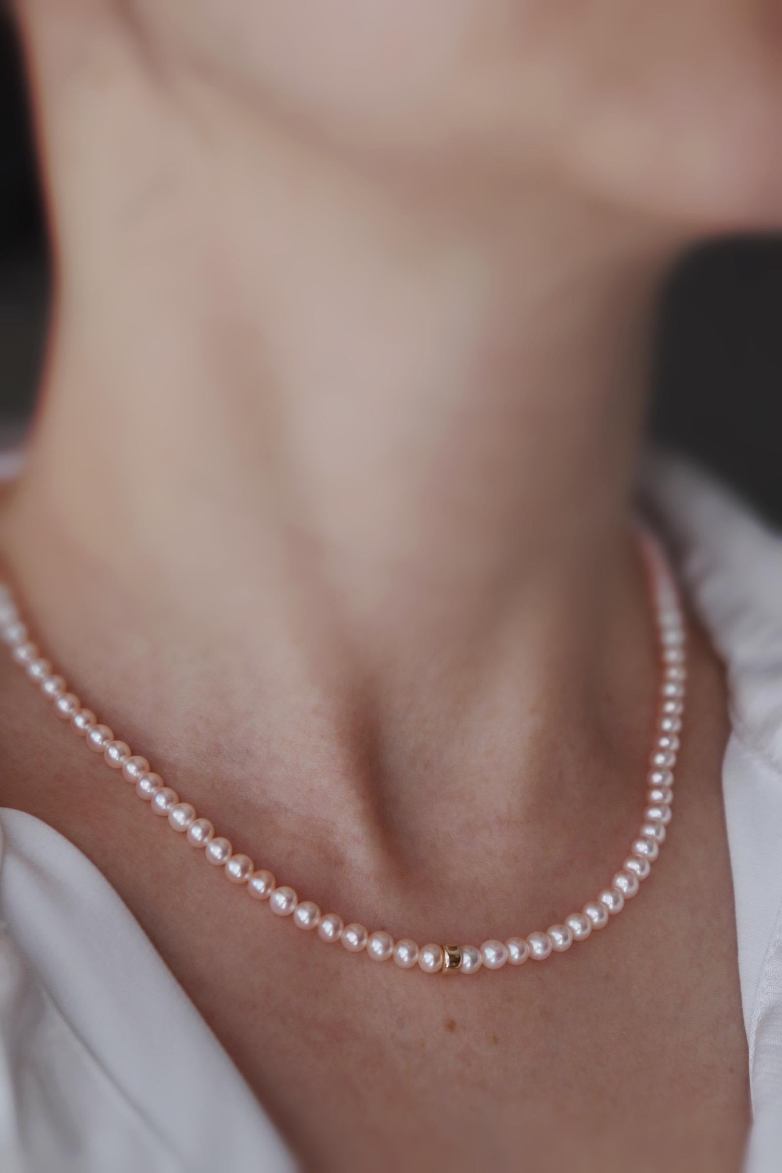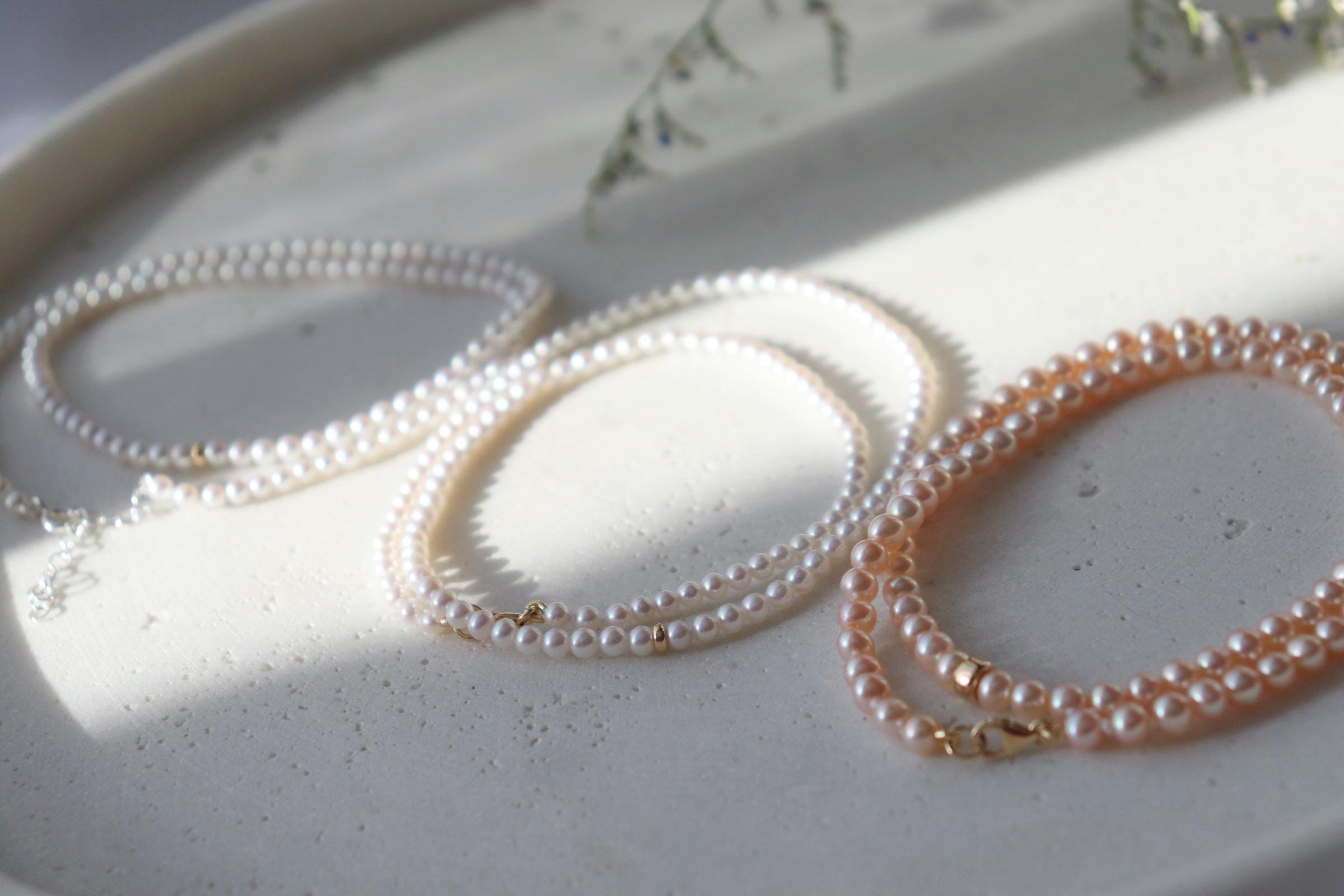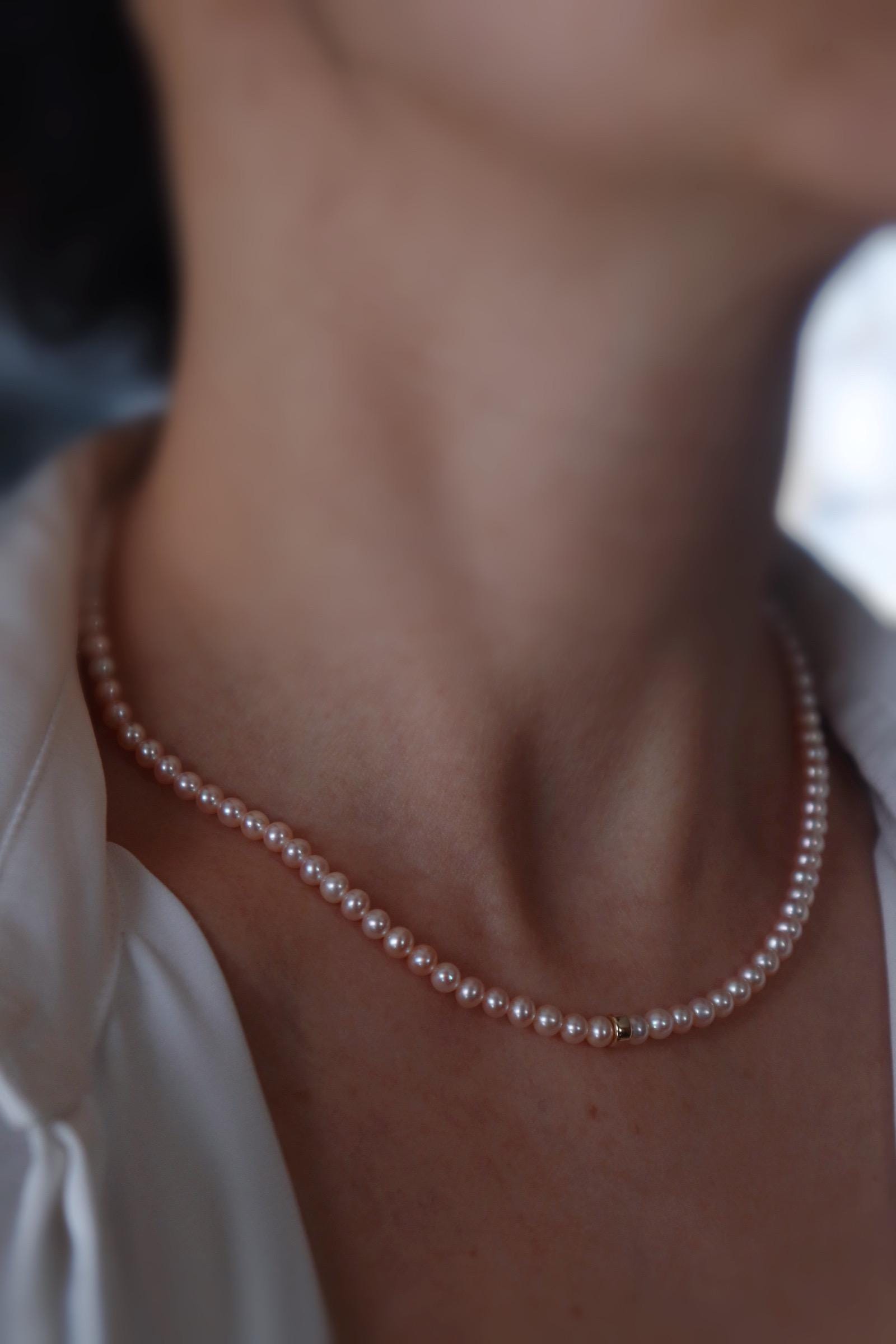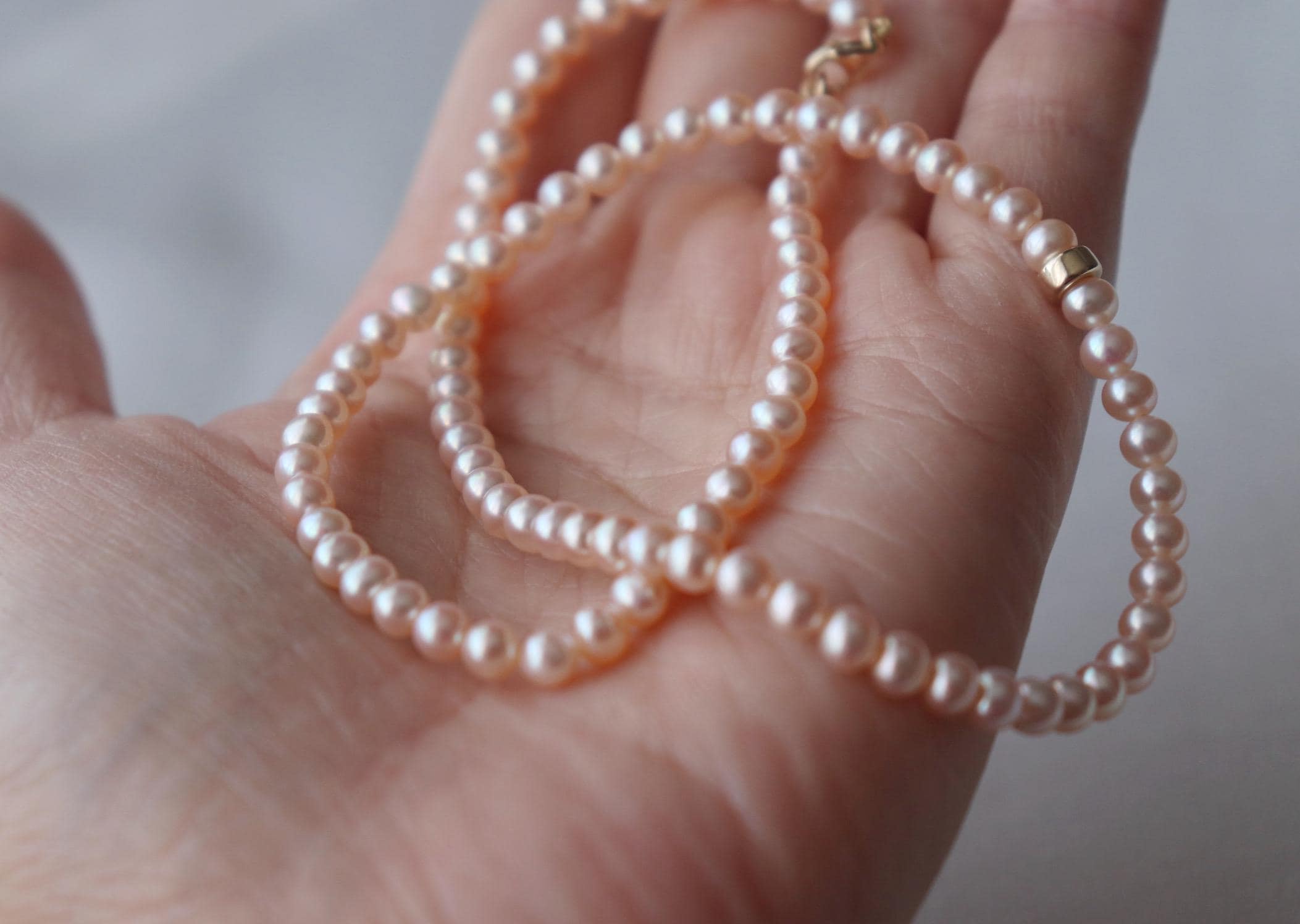 model C : 16 Inches long, peals are 4mm approx, pale orange/ pink freshwater pearls attached with 10kt solid gold clap and jumpring.