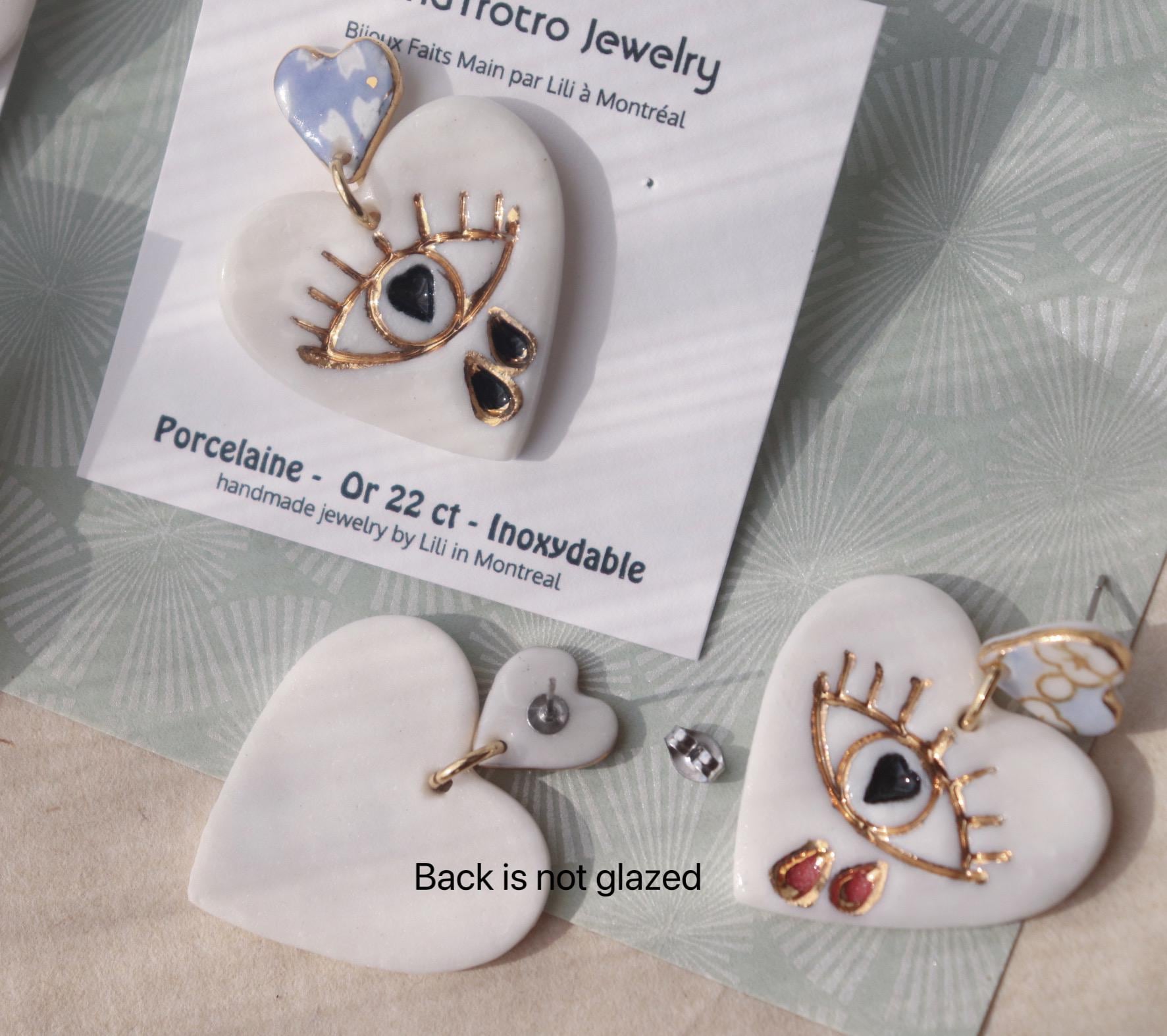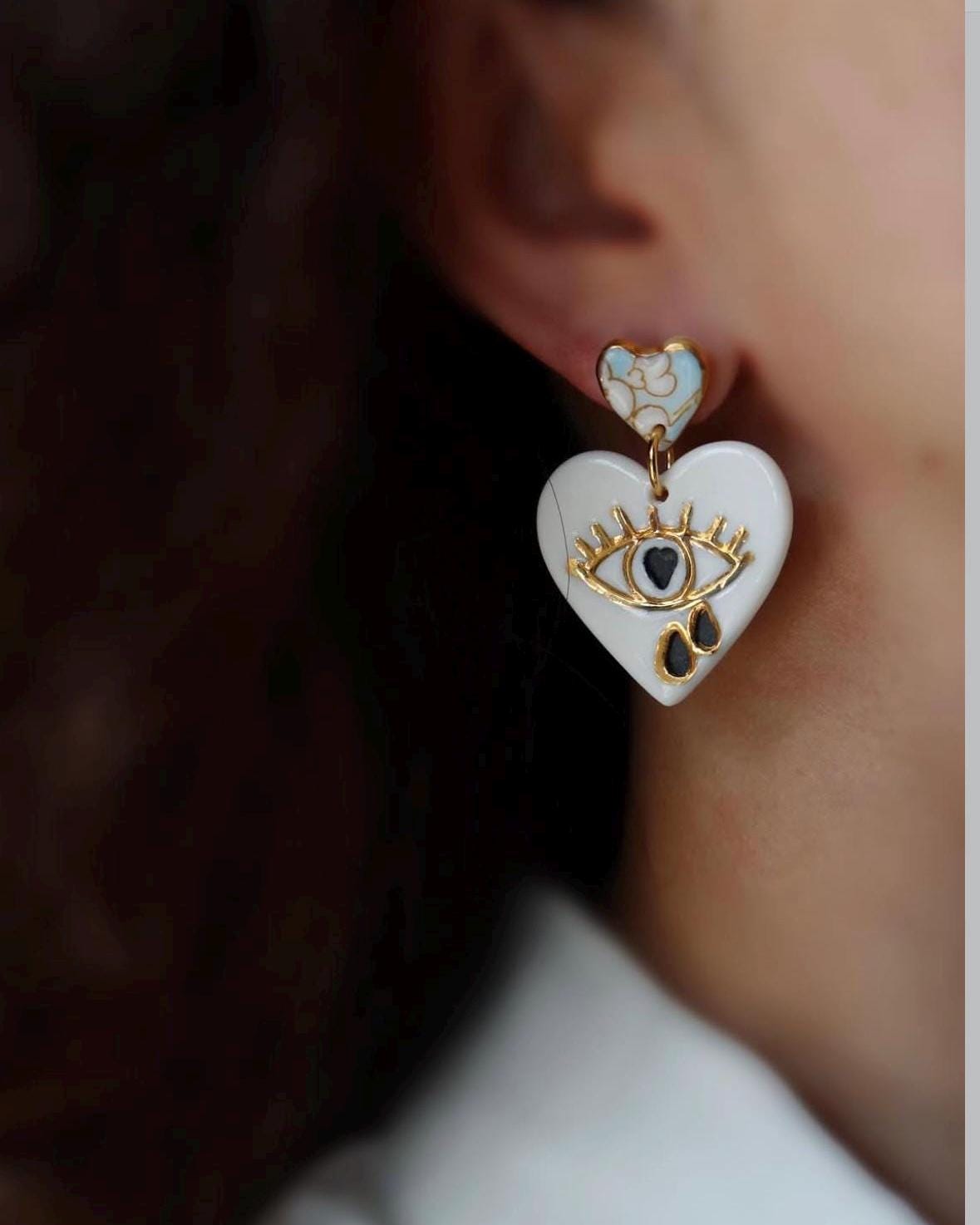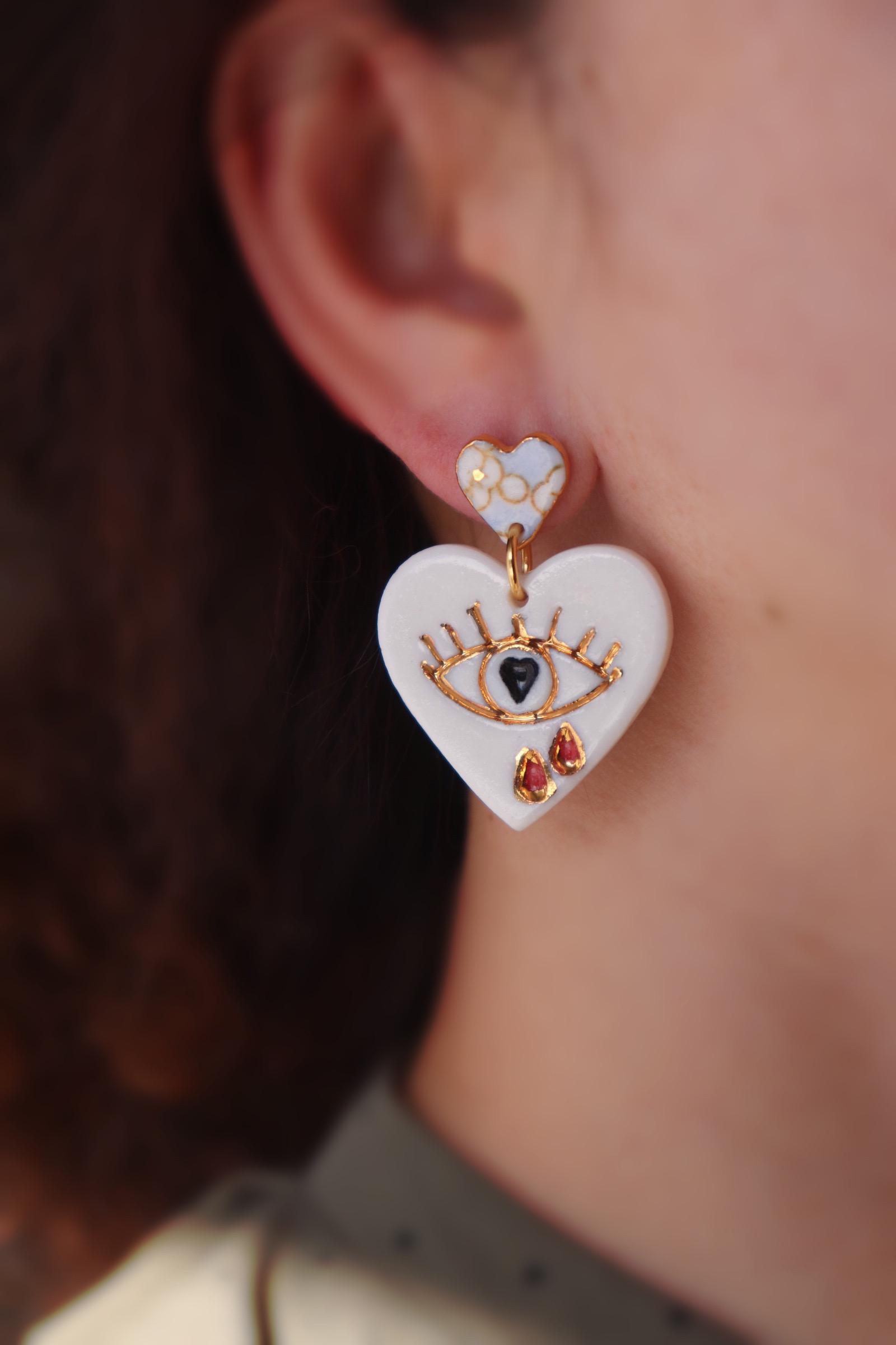Handpainted heart shaped porcelain earrings are one of the kind and eye-catching.