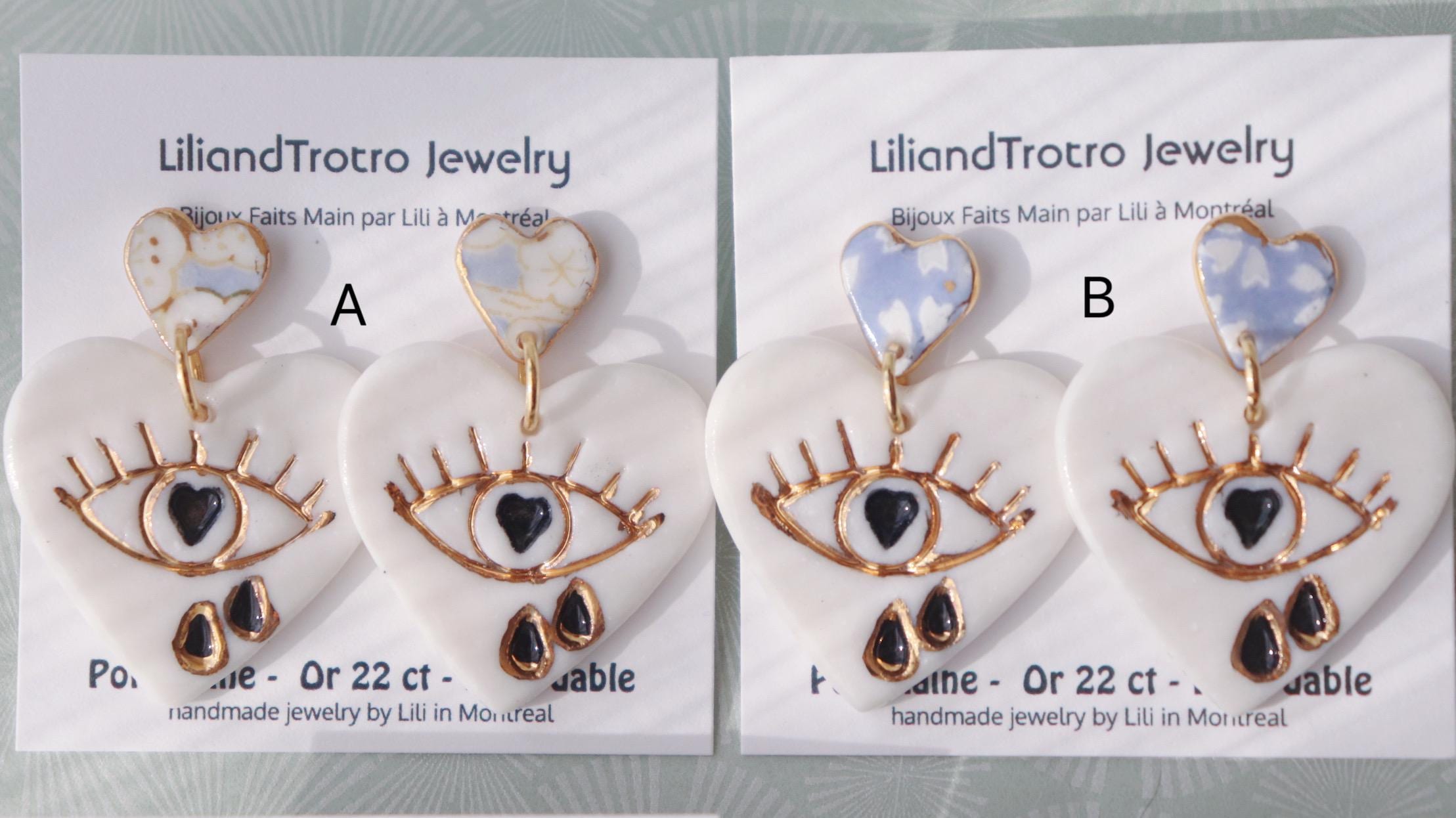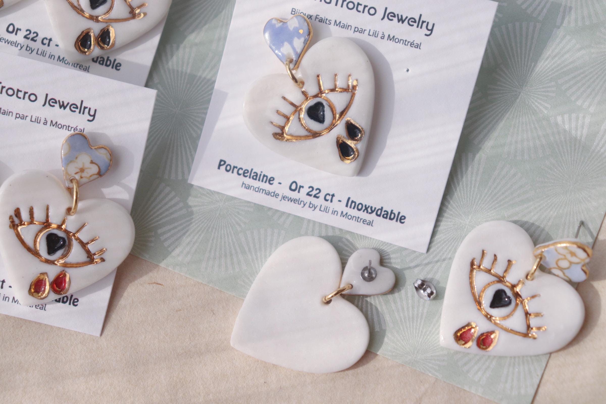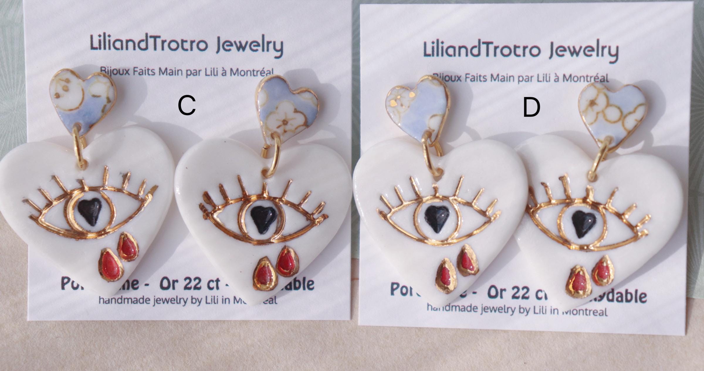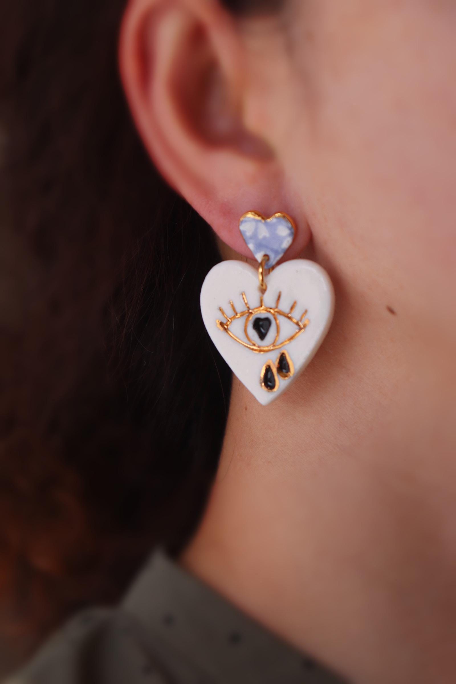 Handpainted heart shaped porcelain earrings are one of the kind and eye-catching.