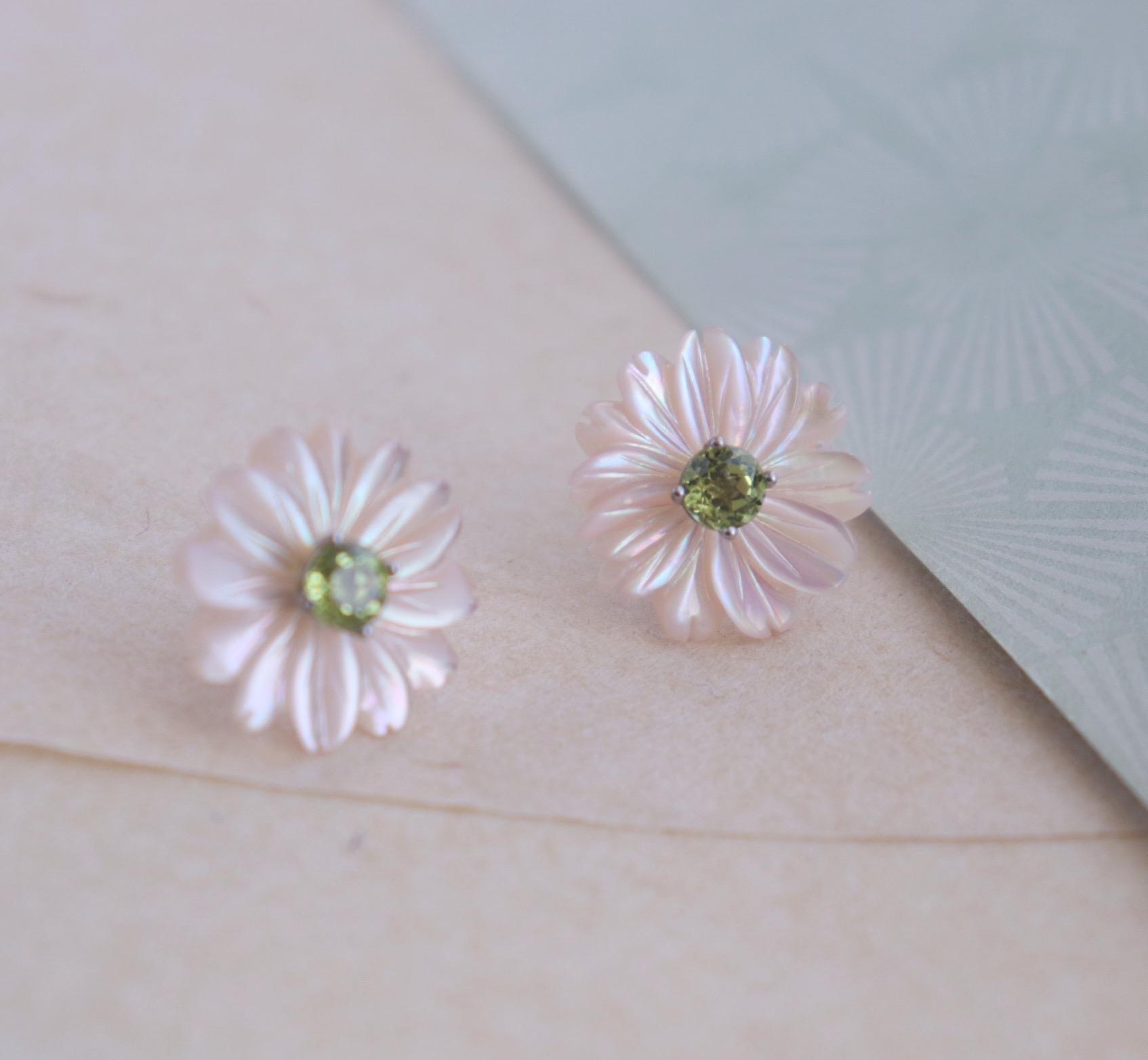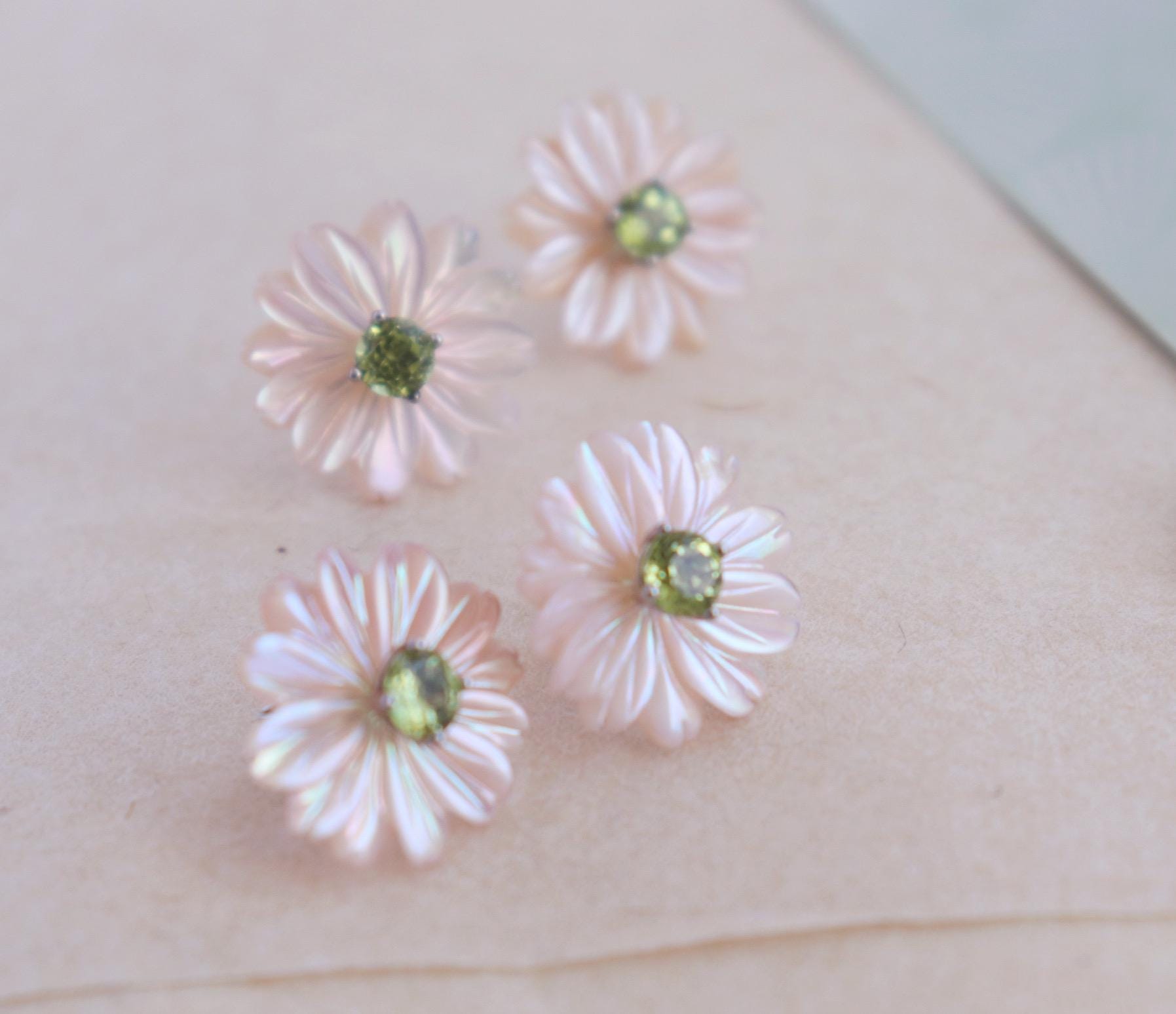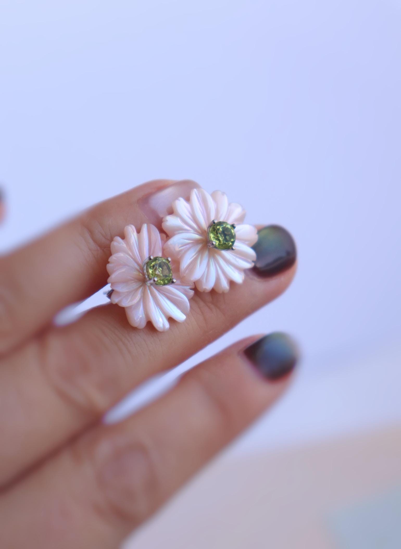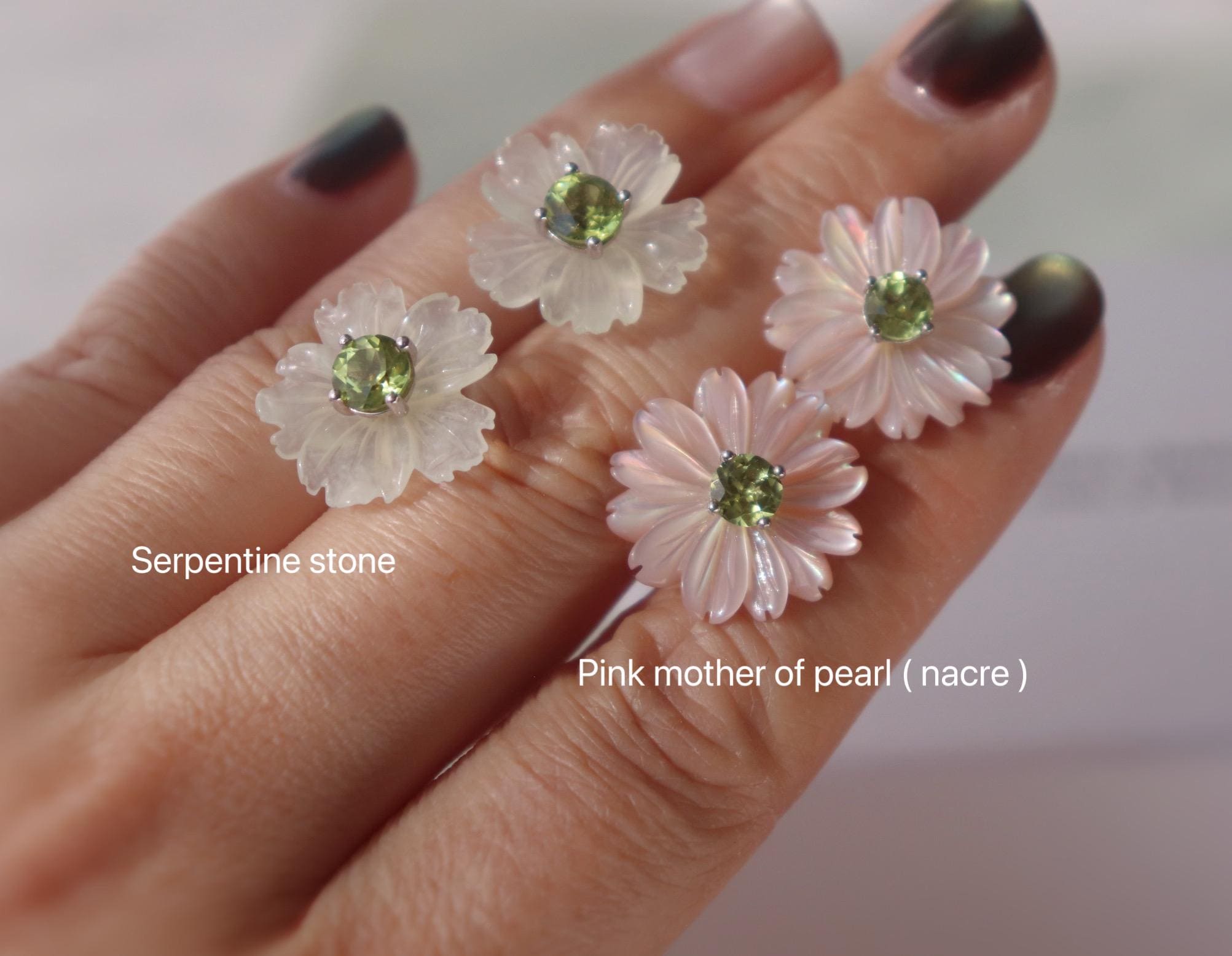 Natural pink mother of pearl ( nacre) or serpentine stone sculpted and set with natural Peridot stone (5mm set with 4 prong ) silver finding.