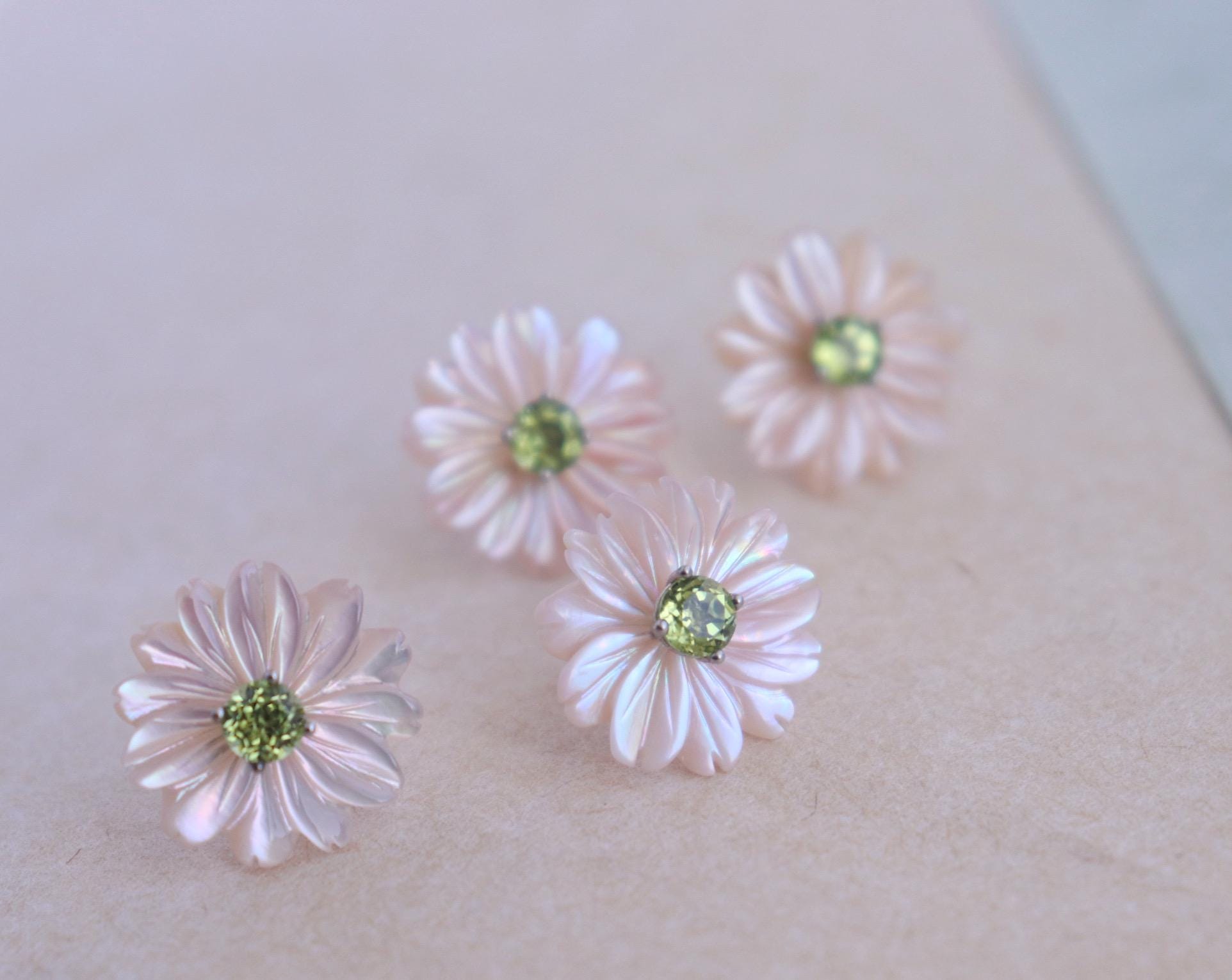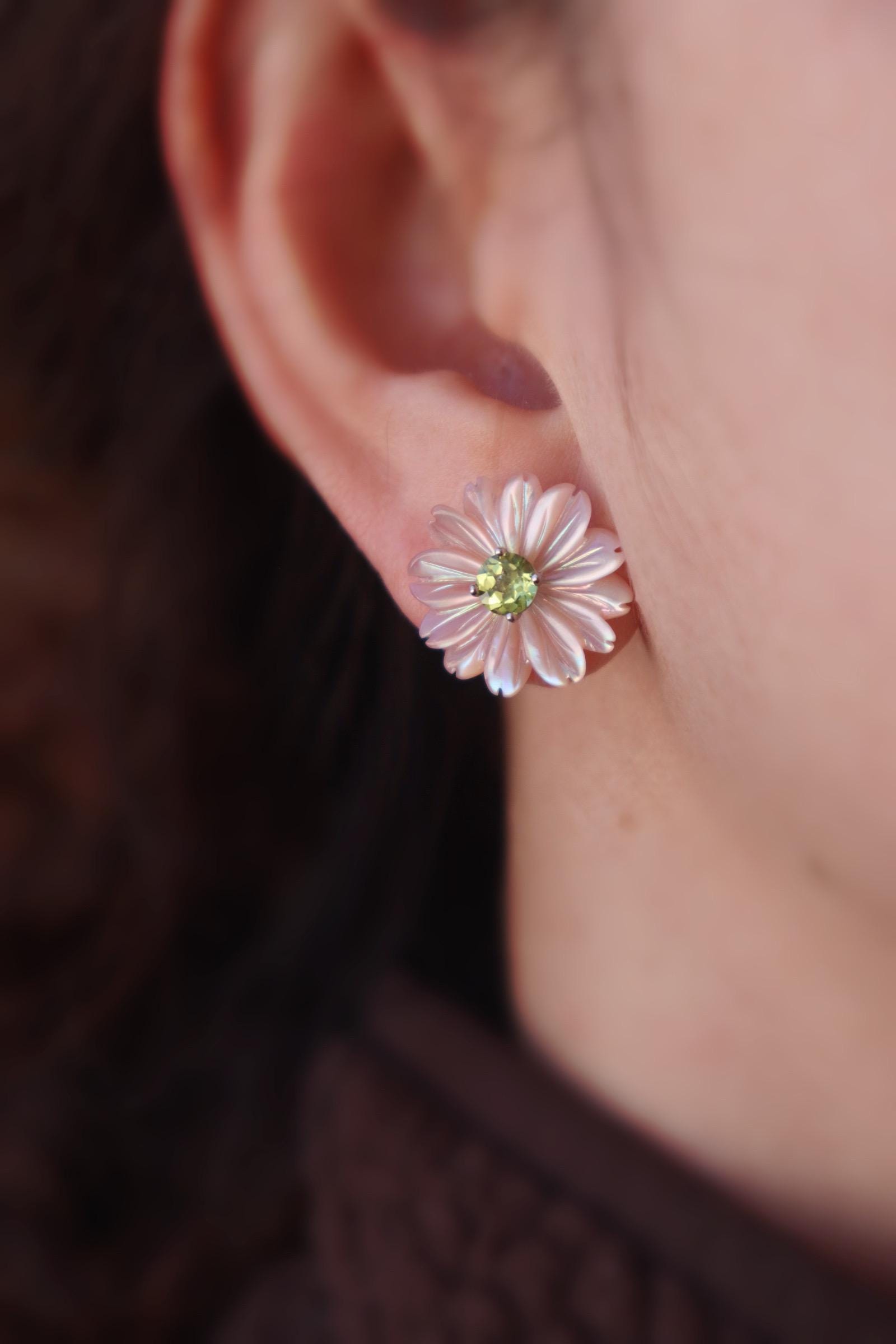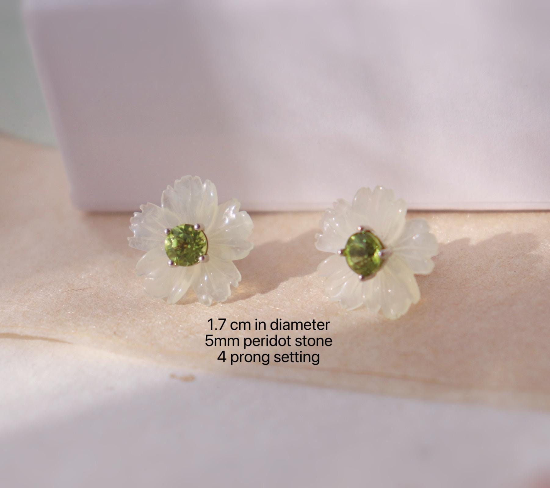 Natural pink mother of pearl ( nacre) or serpentine stone sculpted and set with natural Peridot stone (5mm set with 4 prong ) silver finding.