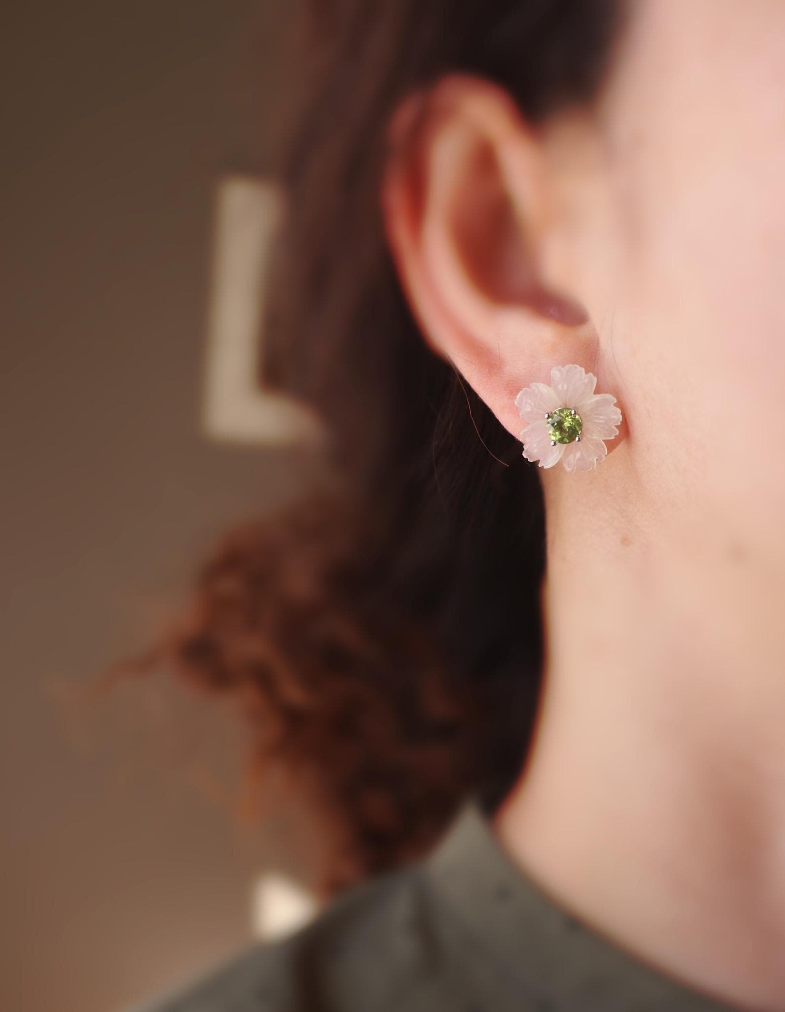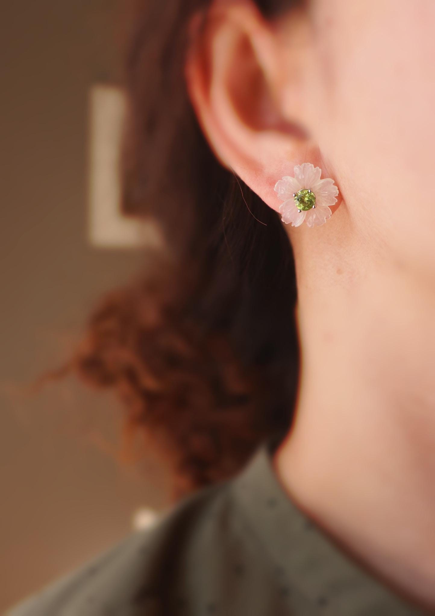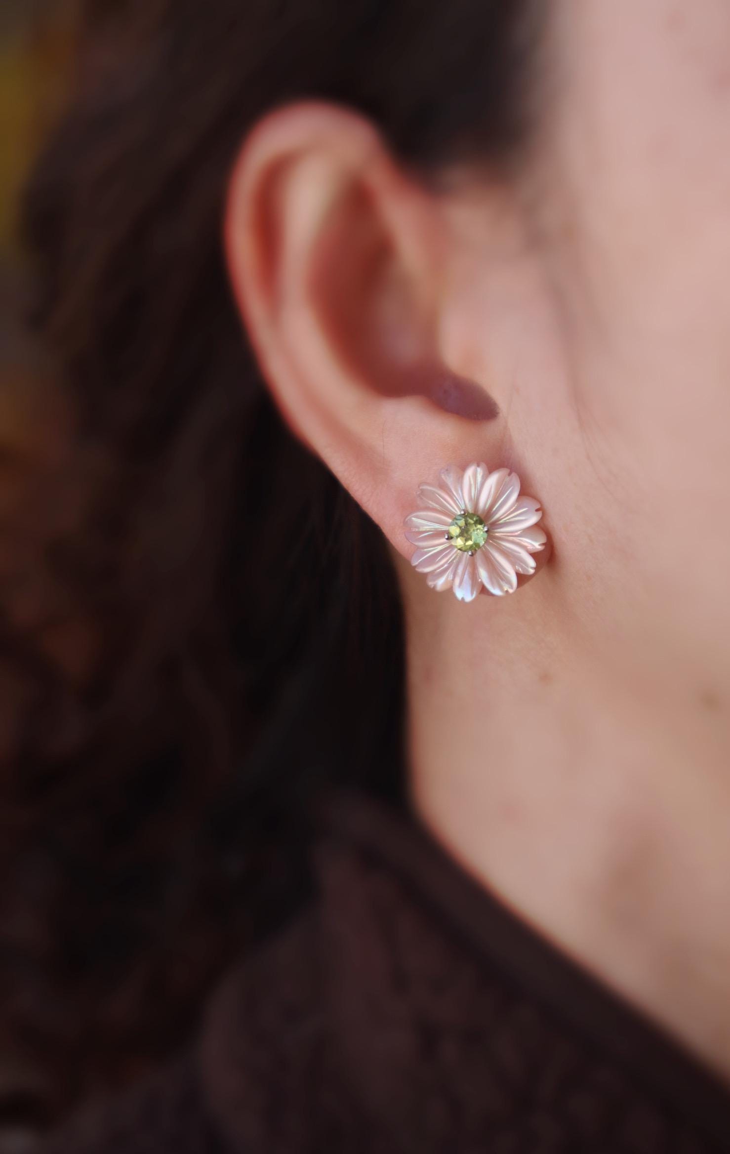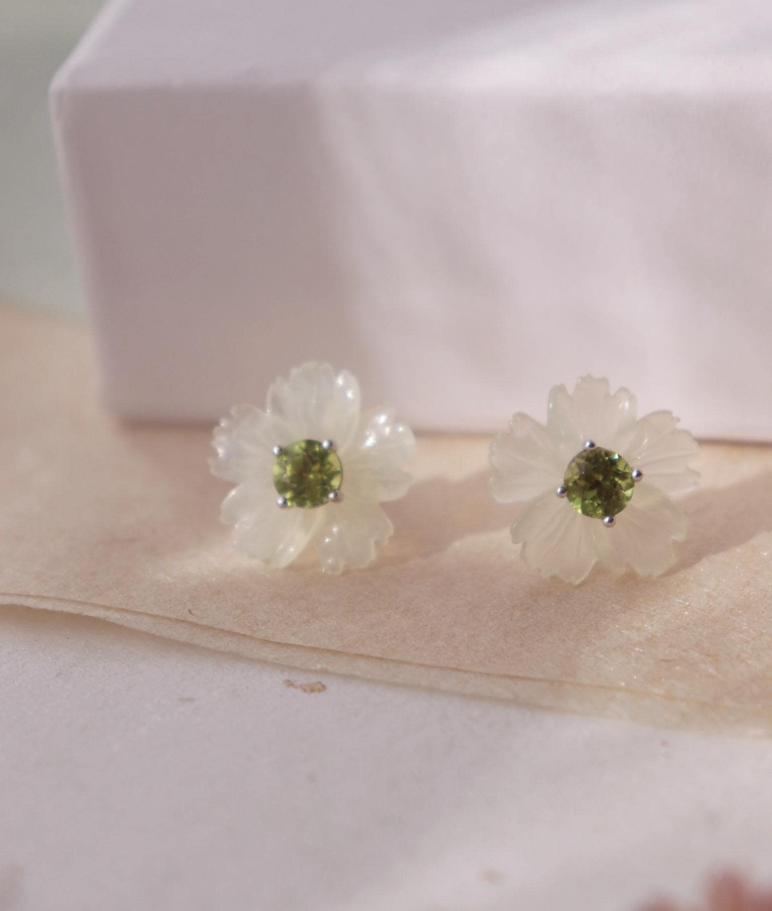Natural pink mother of pearl ( nacre) or serpentine stone sculpted and set with natural Peridot stone (5mm set with 4 prong ) silver finding.