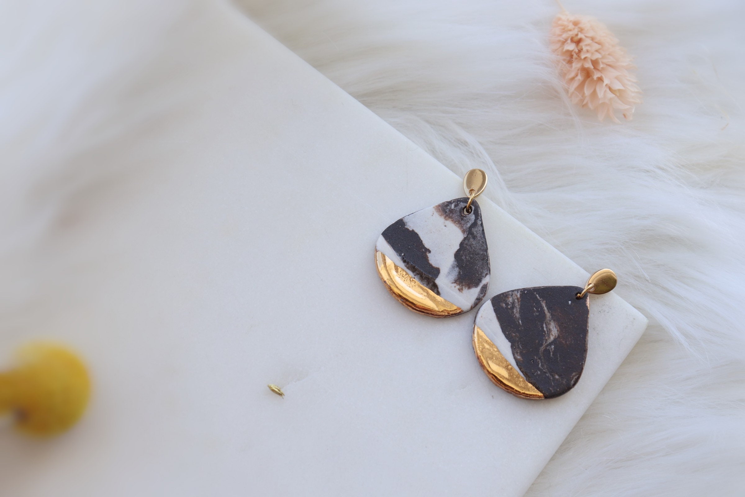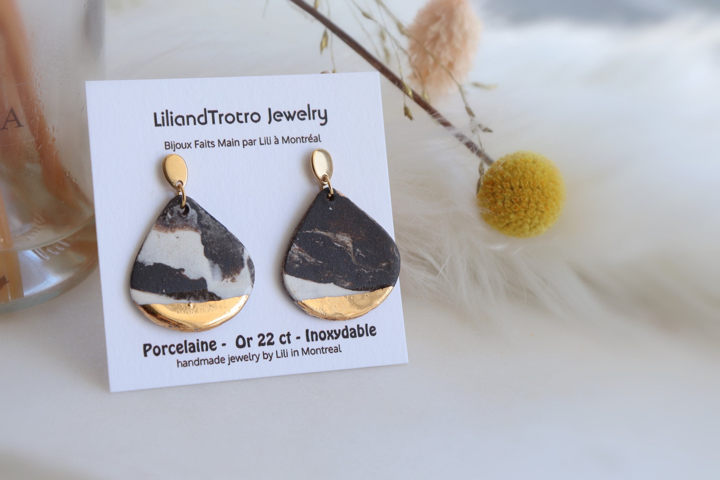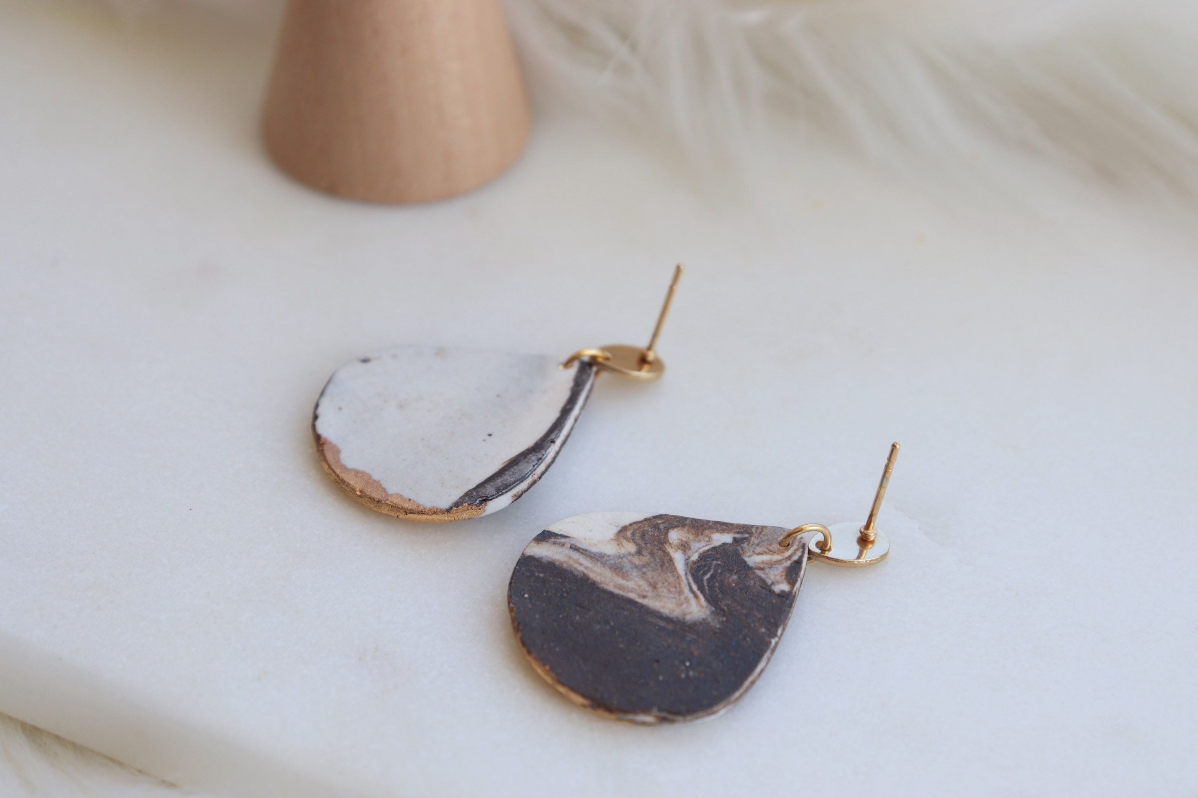 Hand twisted and one of the kind pattern and lines occurred during the clay slabs, Marble Matte gold ceramic earrings are handmade by me in Montreal. These lightweight earrings are fired 3 times in total in a kiln of 1200 degree for more than 25 hours.